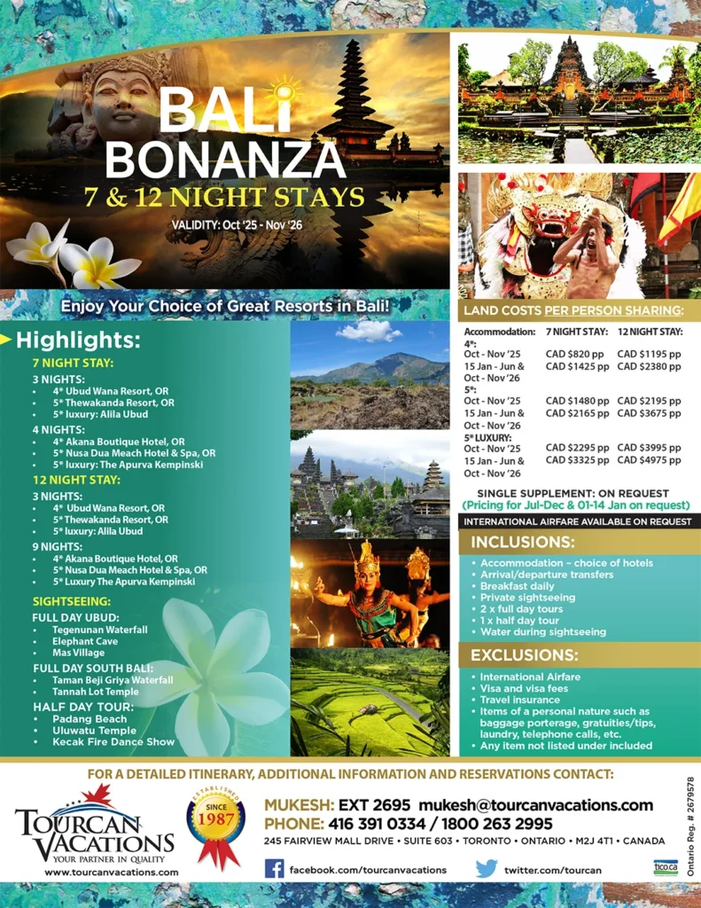 - 12 NIGHT STAY: 3 NIGHTS: • 4* Ubud Wana Resort, OR • 5* Thewakanda Resort, OR • 5* luxury: Alila Ubud 9 NIGHTS: • 4* Akana Boutique Hotel, OR • 5* Nusa Dua Meach Hotel & Spa, OR • 5* Luxury The Apurva Kempinski