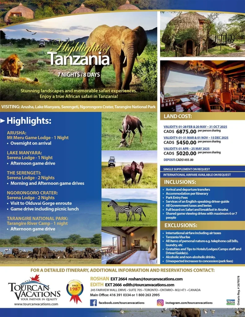 - LAKE MANYARA: Serena Lodge – 1 Night • Afternoon game drive