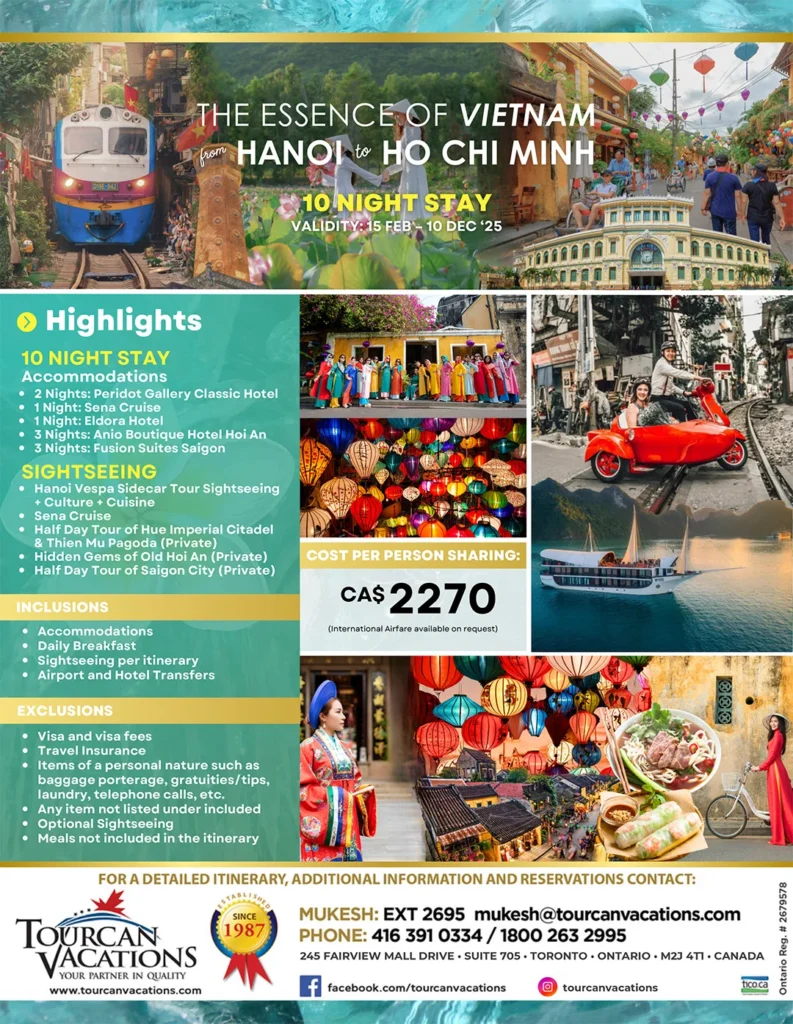 - Accommodations: 2 Nights: Peridot Gallery Classic Hotel, 1 Night: Sena Cruise, 1 Night: Eldora Hotel, 3 Nights: Anio Boutique Hotel Hoi An, 3 Nights: Fusion Suites Saigon