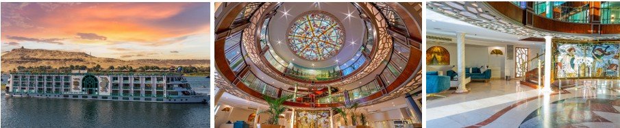 Sonesta Moon Goddess Nile Cruise Ship offers 49 luxurious cabins with sliding glass doors opening to private balconies and 4 presidential suites with a private lounge. All accommodations feature their own private balcony. Sonesta Moon Goddess docks in front of Luxor Temple, before Luxor Bridge and docks in Aswan at Nile Dream Dock (in front of Aswan Sport Club).
