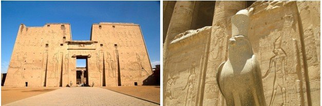 Dedicated to the falcon headed god; Edfu (Horus) temple was built during the reigns of six Ptolemies. We have a great deal of information about its construction from reliefs on outer areas. It was begun in 237 BC by Ptolemy III Euergetes I and was finished in 57 BC. Most of the work continued throughout this period with a brief interlude of 20 years while there was unrest during the period of Ptolemy IV and Ptolemy V Epiphanes. This is not only the best preserved ancient temple in Egypt, but the second largest after Karnak. It was believed that the temple was built on the site of the great battle between Horus and Seth. Hence, the current temple was but the last in a long series of temples build on this location. It is said that the original structure housing a statue of Horus was a grass hut built in prehistoric times.