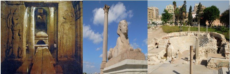 Visit the Catacombs of Kom el Shoqafa; the necropolis of 3 sub-levels dating from the 2nd century AD merges aspects of Egyptian, Greek, and Roman culture in its features. See the Roman triclinium – a banquet hall to honor the dead, as well as statues, reliefs, and a pillared lobby featuring depictions of Egyptian gods in Roman armor.